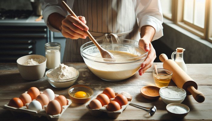 - اضافه کردن آرد: آرد الک شده را به تدریج به مواد اضافه کنید و با لیسک یا قاشق چوبی به آرامی هم بزنید تا مخلوط یکدستی حاصل شود.